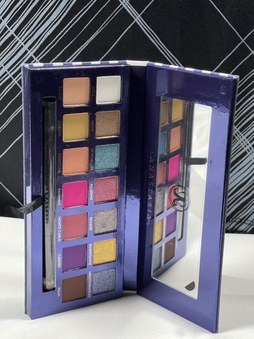 Anastasia Beverly Hills eyeshadow palette with navy and white stripes.