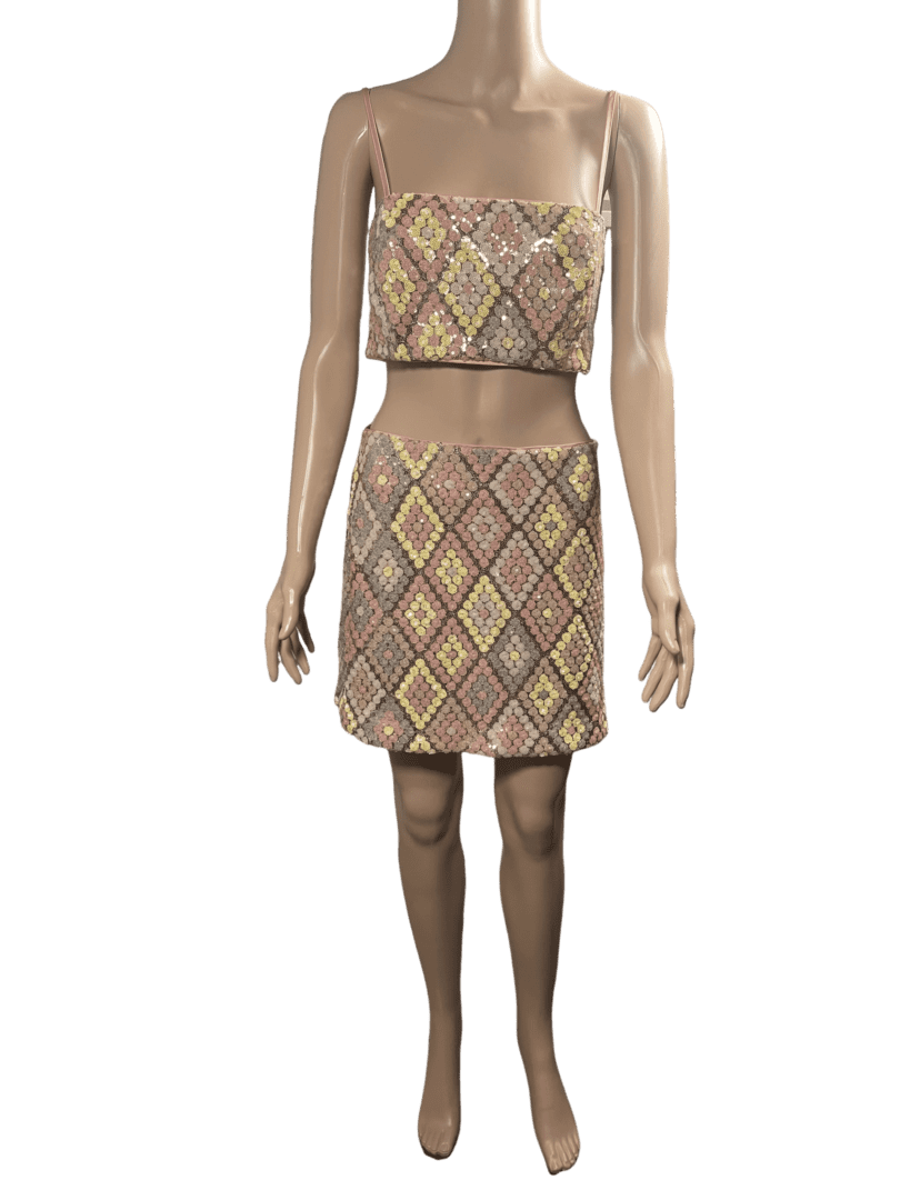 Caroline Constas luxury multicolor sequins mini skirt set with slim strap cropped top size 6