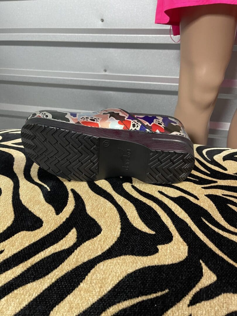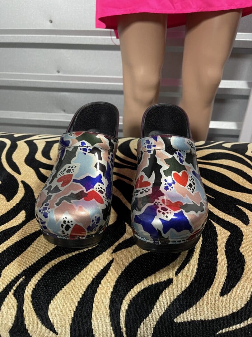 Person wearing colorful floral clogs on a zebra-patterned rug.