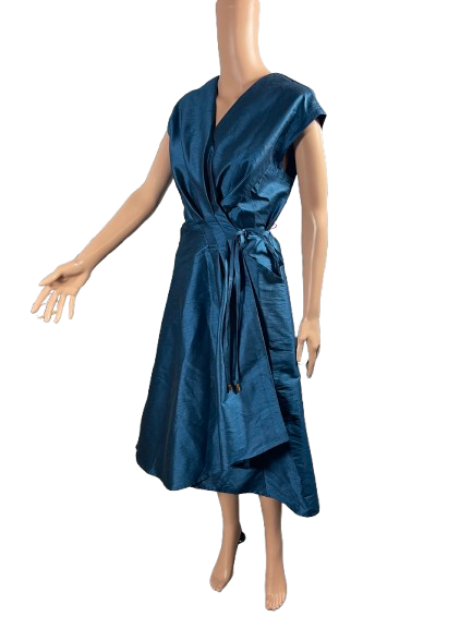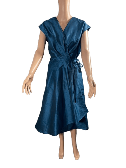 Elegant blue satin wrap dress with cap sleeves and a waist tie.