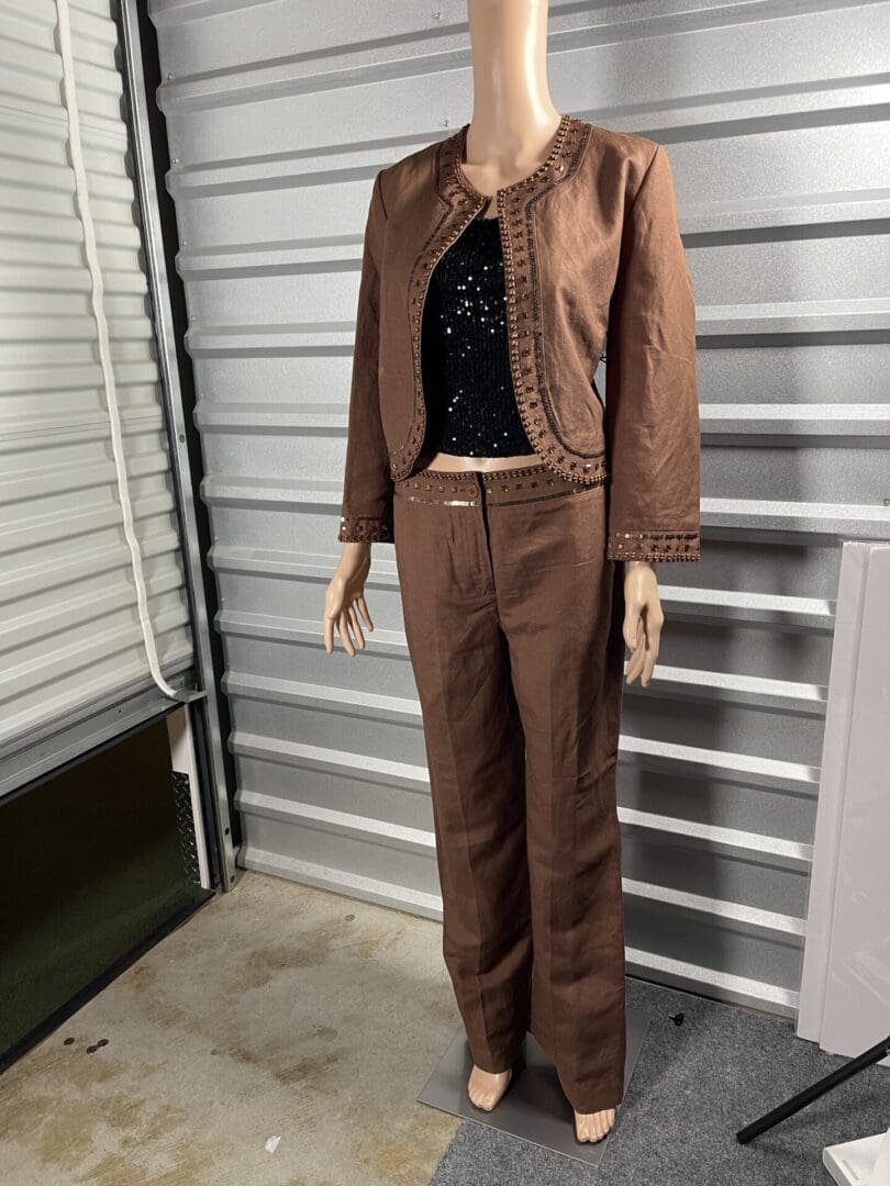 Dress Barn, Jeweled brown linen pant 2pcs set with Jeweled cropped buttonless jacket size XL