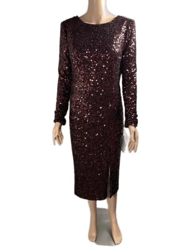 Elegant sequined burgundy dress with long sleeves and midi length.
