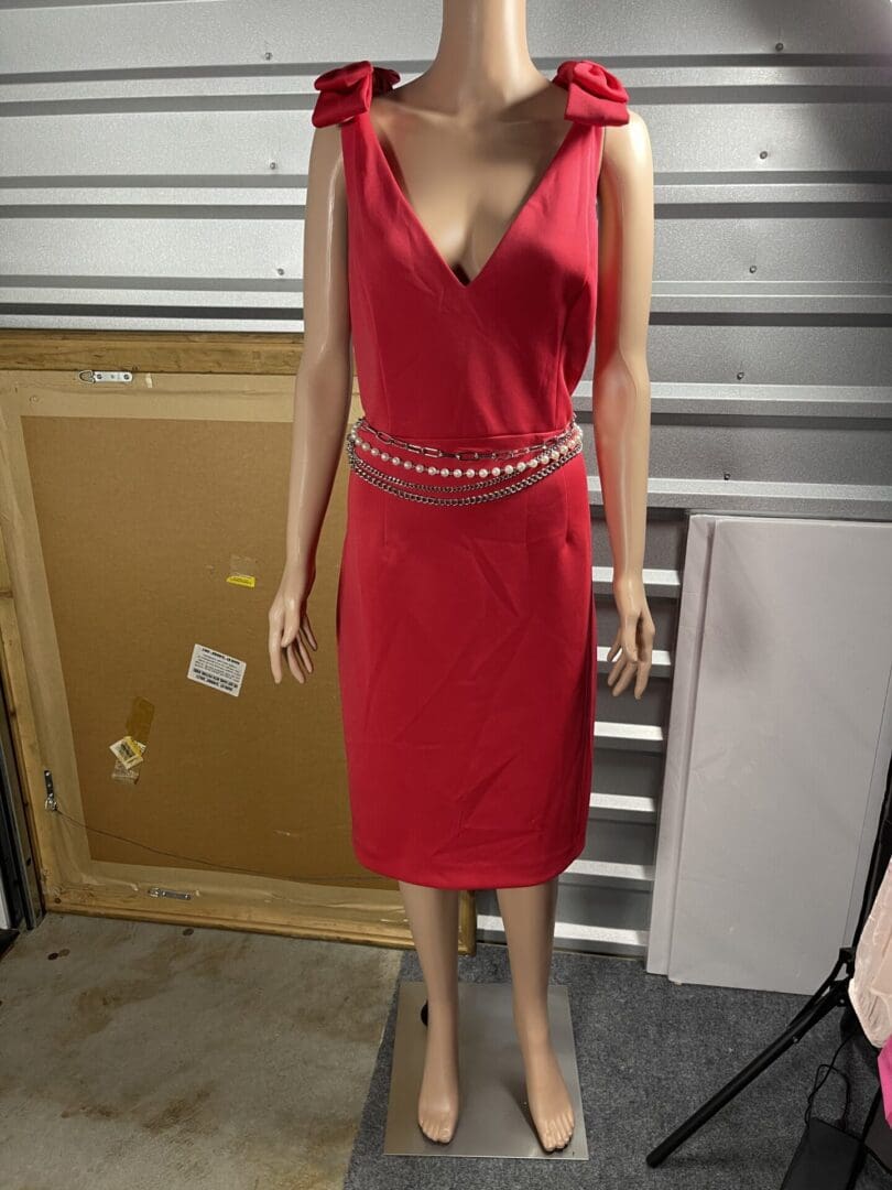 A person wearing a sleeveless red dress with a silver belt.