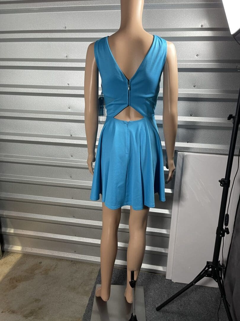 Blue sleeveless dress with cutout design displayed on a mannequin.