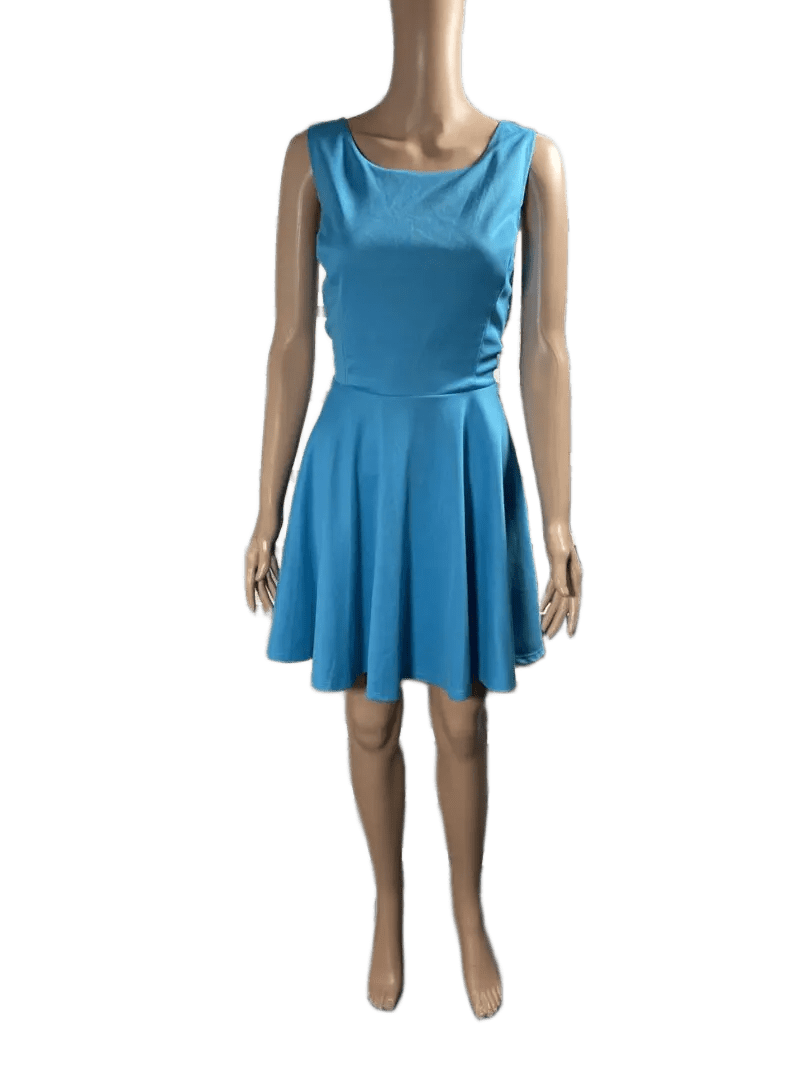 A sleeveless blue dress with a fitted bodice and flared skirt.