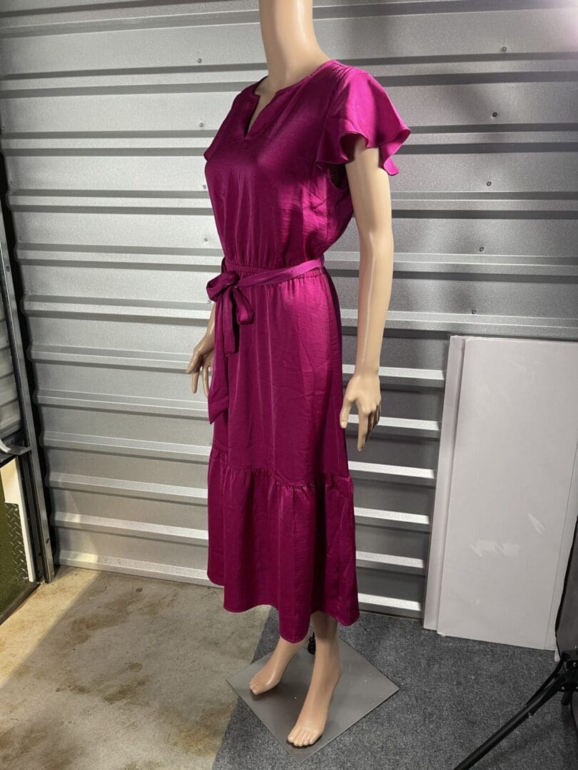 Woman wearing a shiny magenta satin dress with a tie waist.