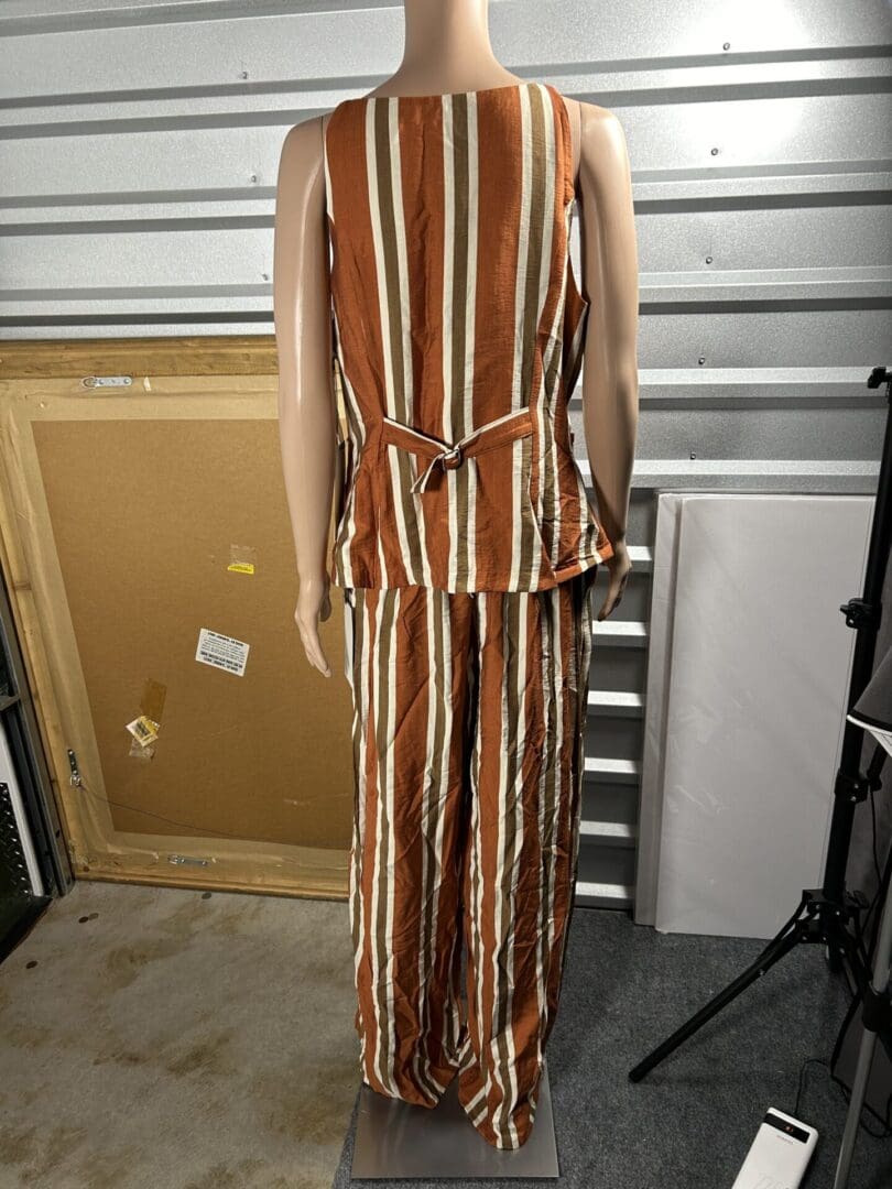 Sleeveless striped brown and white outfit displayed on a mannequin.