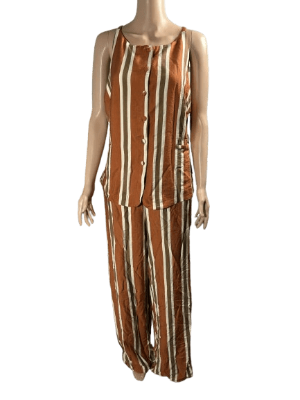 Woman wearing a brown and white striped sleeveless top and matching pants.