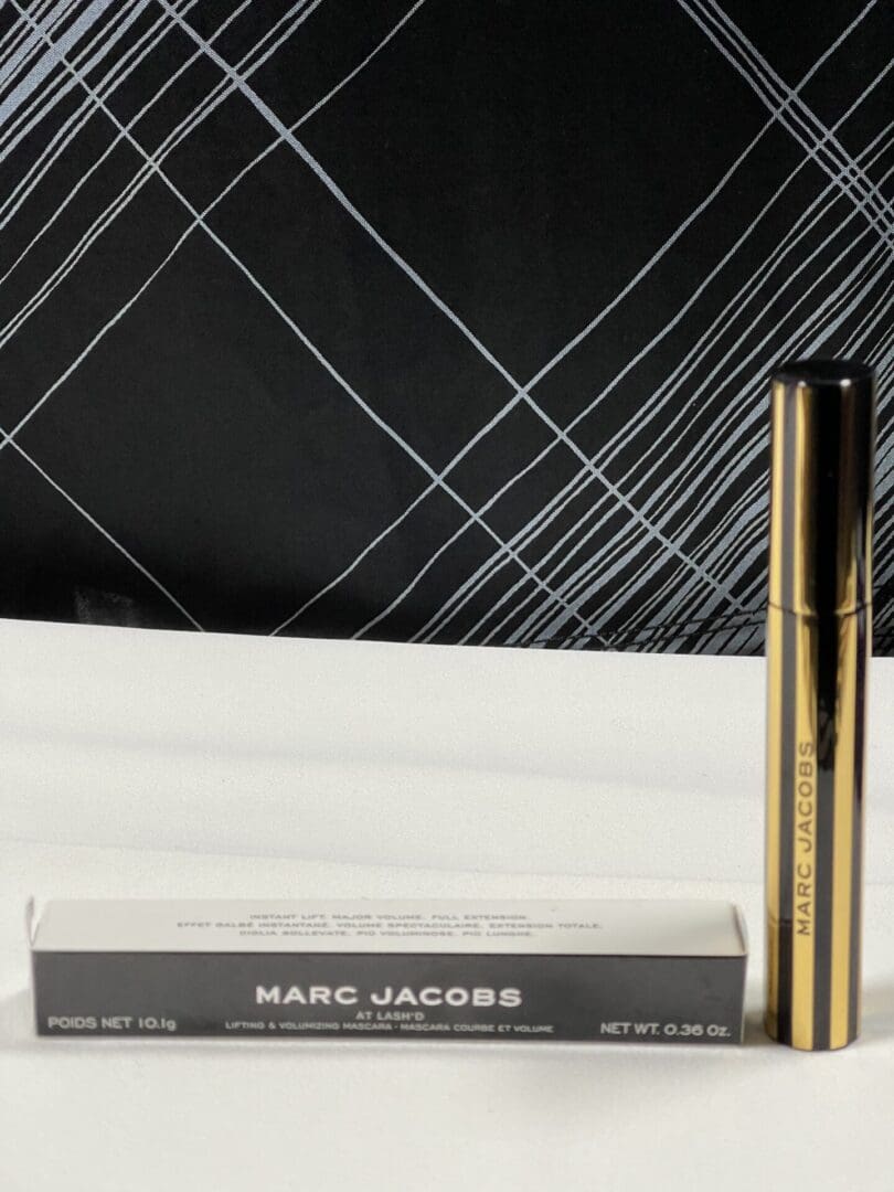 Marc Jacobs lipstick and a gold mascara tube on a black and white background.
