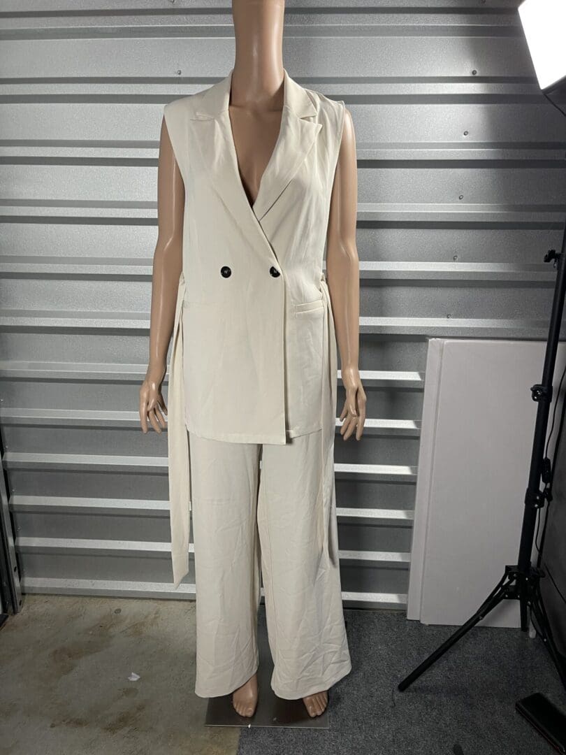 Melloday, beige wide leg pant size XL 2pcs set with beige sleeveless belted jacket size L