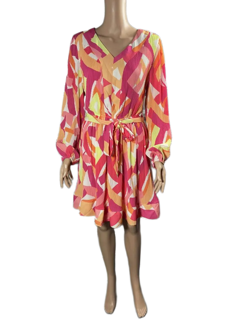 Nicole Miller, pleated multicolor belted dress, long sleeve V neck size L