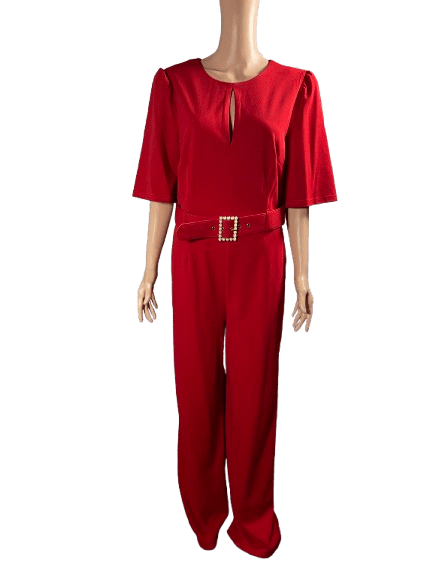 Woman in a stylish red jumpsuit with a belt and flared sleeves.