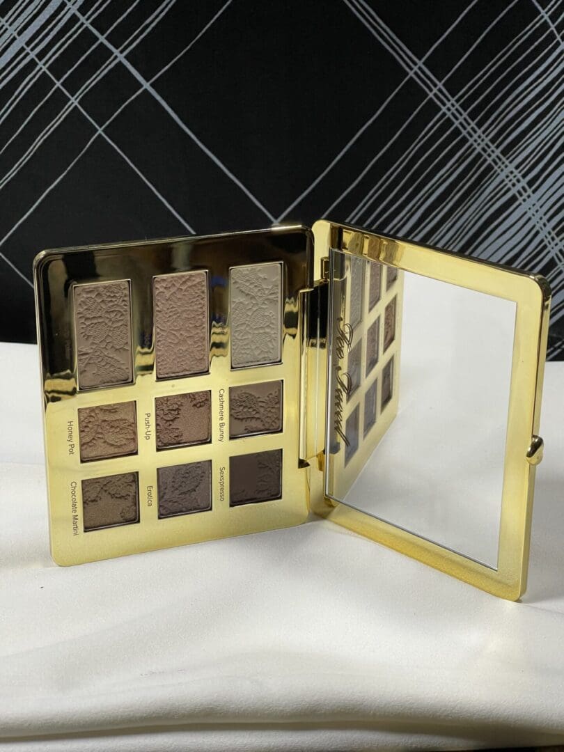 Open eyeshadow palette with various brown and gold shades and a mirror.