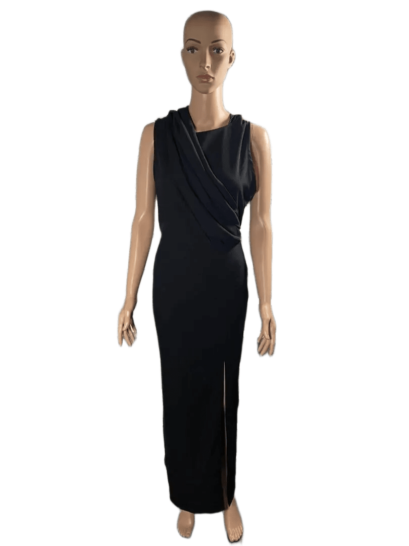 Black sleeveless evening gown with a cowl back detail on a mannequin.