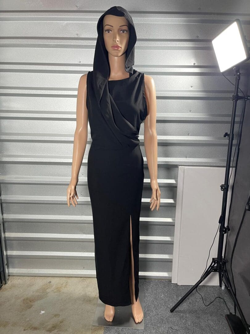 Elegant black sleeveless dress with a side slit on a mannequin in a studio.