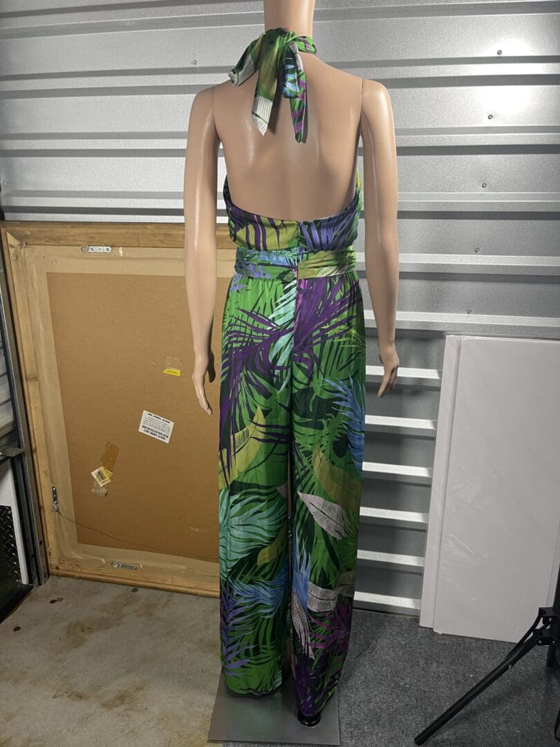 Back view of a woman in a colorful tropical jumpsuit with a halter neck.
