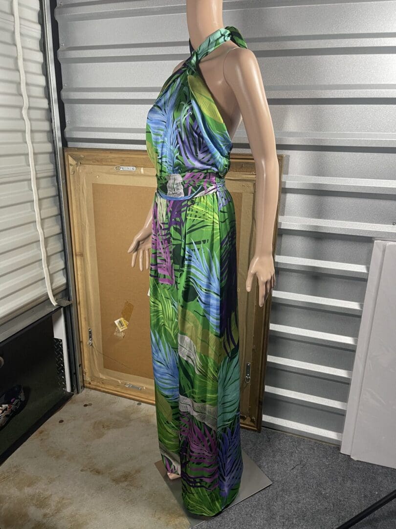 Side view of a mannequin wearing a colorful halter-neck maxi dress.