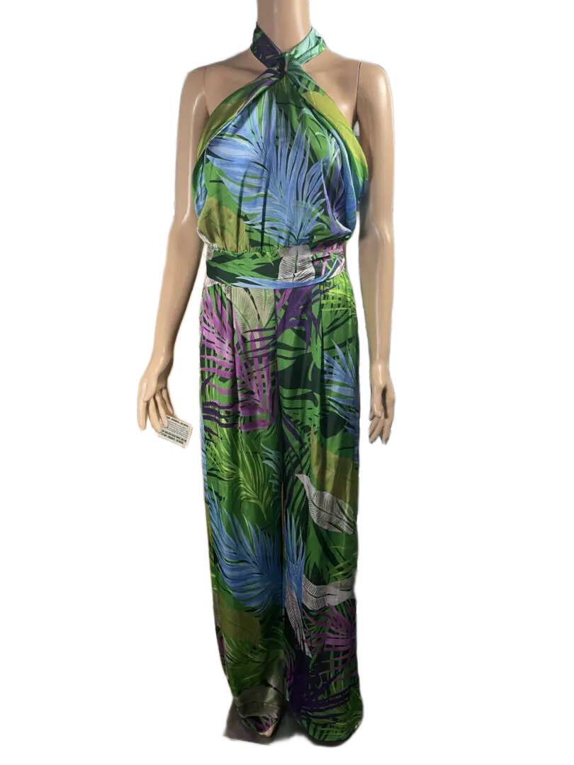 Zara green/multi satin wide leg halter jumpsuit size S